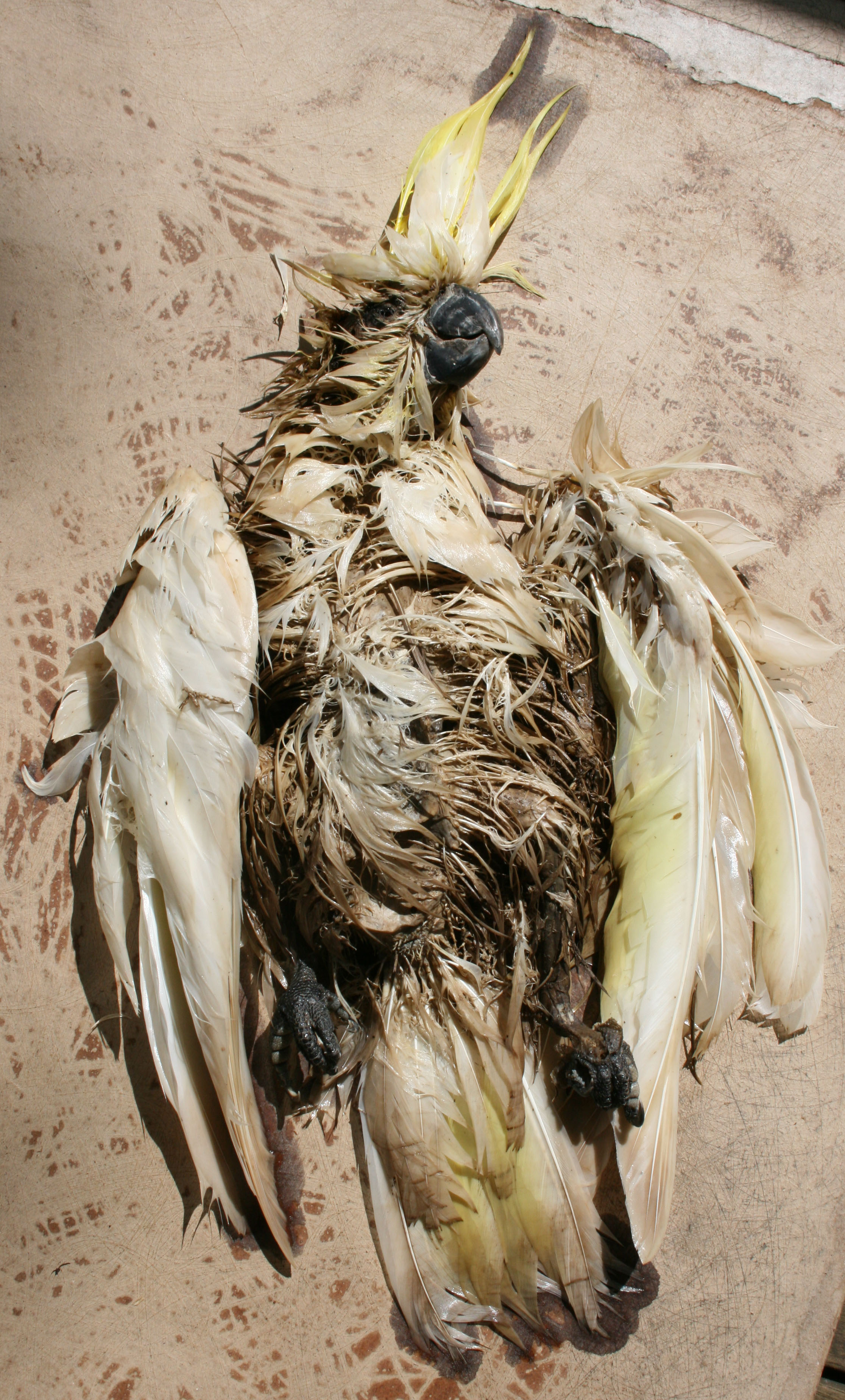 On the same day I saw and collected one dried and one fresh white cockatoo body. The white feathers and yellow crest matching the delek pigments collected in Maburrinj. I placed the fresh bird in the freezer, and placed the dried one in metho. The latter had the sweeter smell of the drier stages of decomposition. Its body cavity is exposed, especially at the back, but its front, with its skeletal face and full crest in tact are what I wish to paint in my current work featuring the currawong.