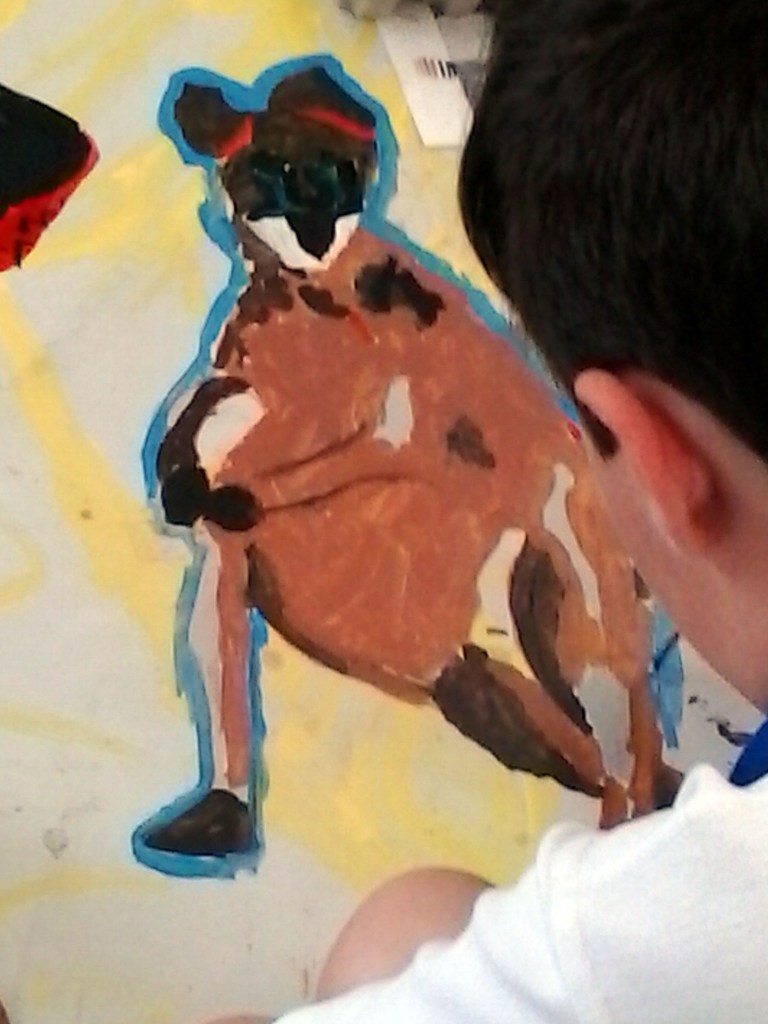 Yewande and I walked to the shroud site yesterday and saw the stingray very dried and the kangaroo losing fur now and internal liquids. In the studio I have been stitching canvas soaked in eucalyptus and wattle leaves to the back of the woodducks shroud to fill the holes in the body stain. I have also been working in ochre on ‘Nebachudanezar making a Cloud (after Boyd)’. Today I began working on the Woollamia Rosella shroud using oils and find the fumes a shock after using ochres. Yesterday I also began a mural project with local school student Eliza. The design and painting method were all her idea and its looking good!