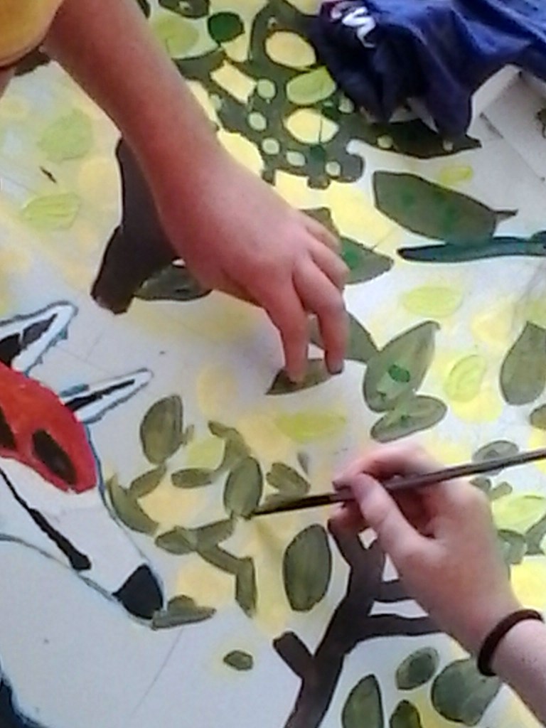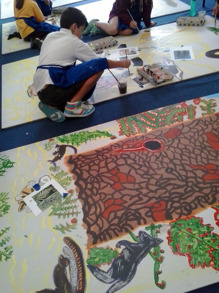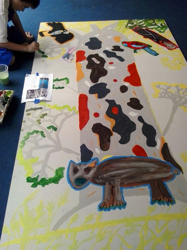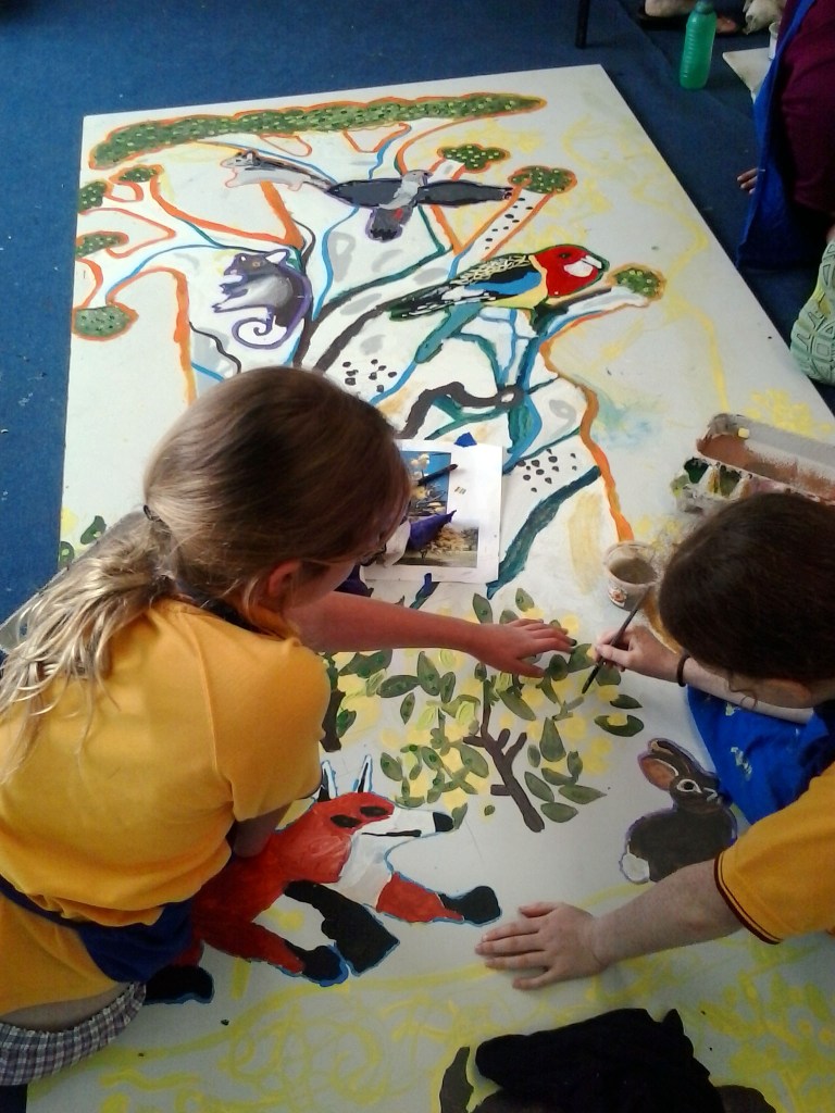 The talented year 5 and 6 students of Tomerong public school have been creating an amazing four panel mural. The theme is local tall trees crowded with local animals and birds.