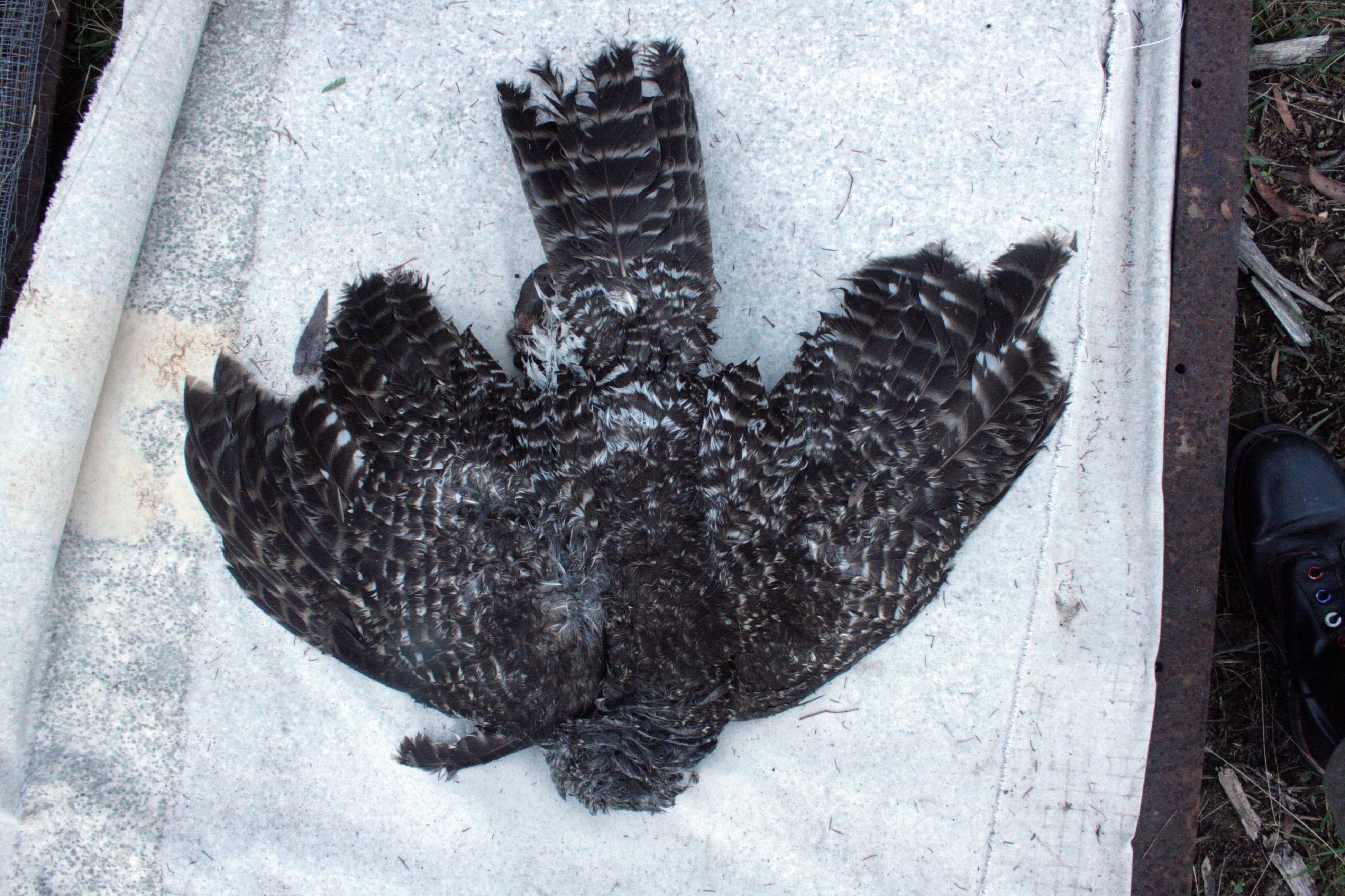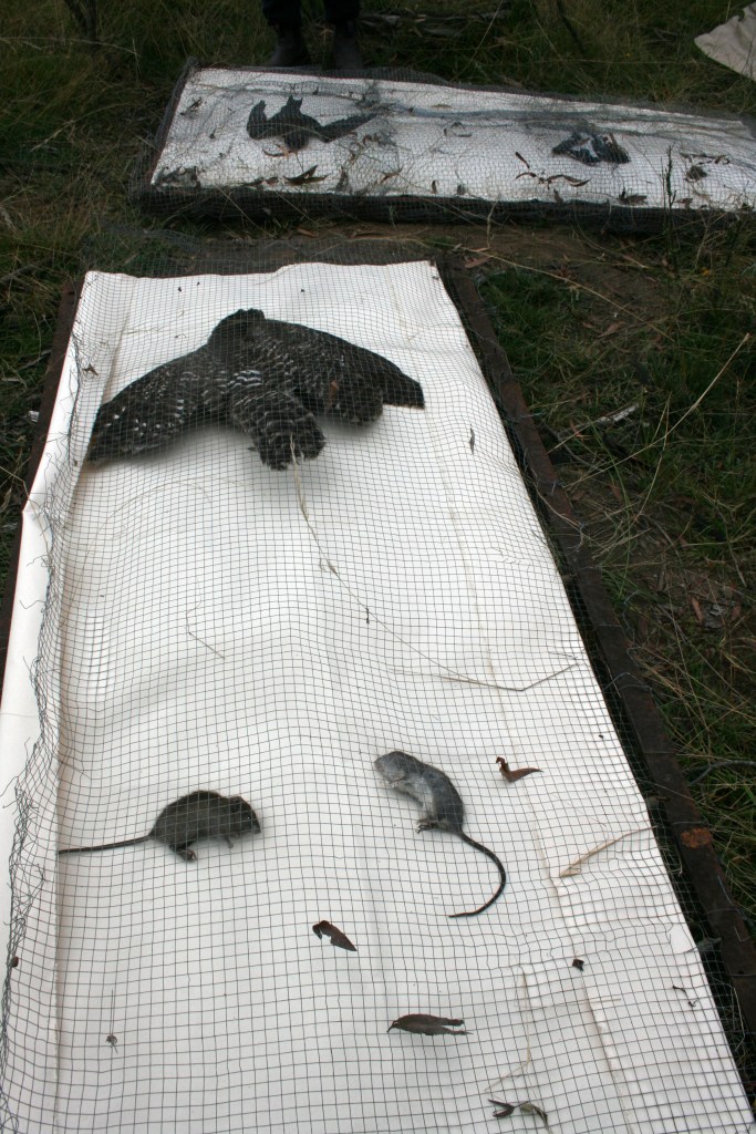 Darren and I set up my first shroud set at David and Linda’s farm in Nerriga today. A juvenile sooty tern, a magpie lark, a spotted pardalote, a powerful owl and two rats. David said pigs had been digging in the area so hopefully the wire holds the precious bodies in place.