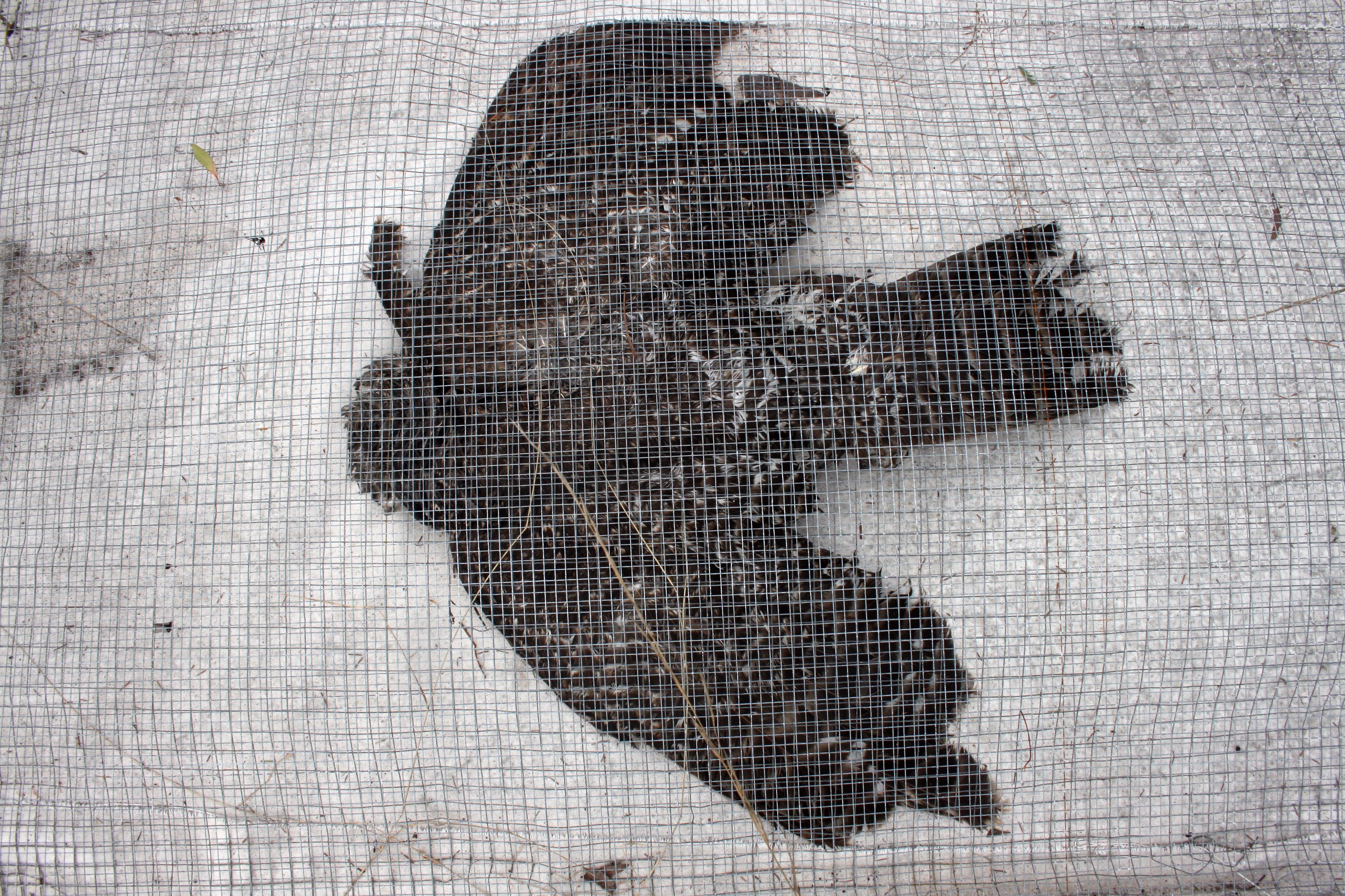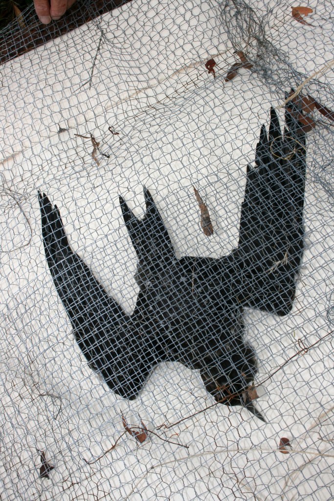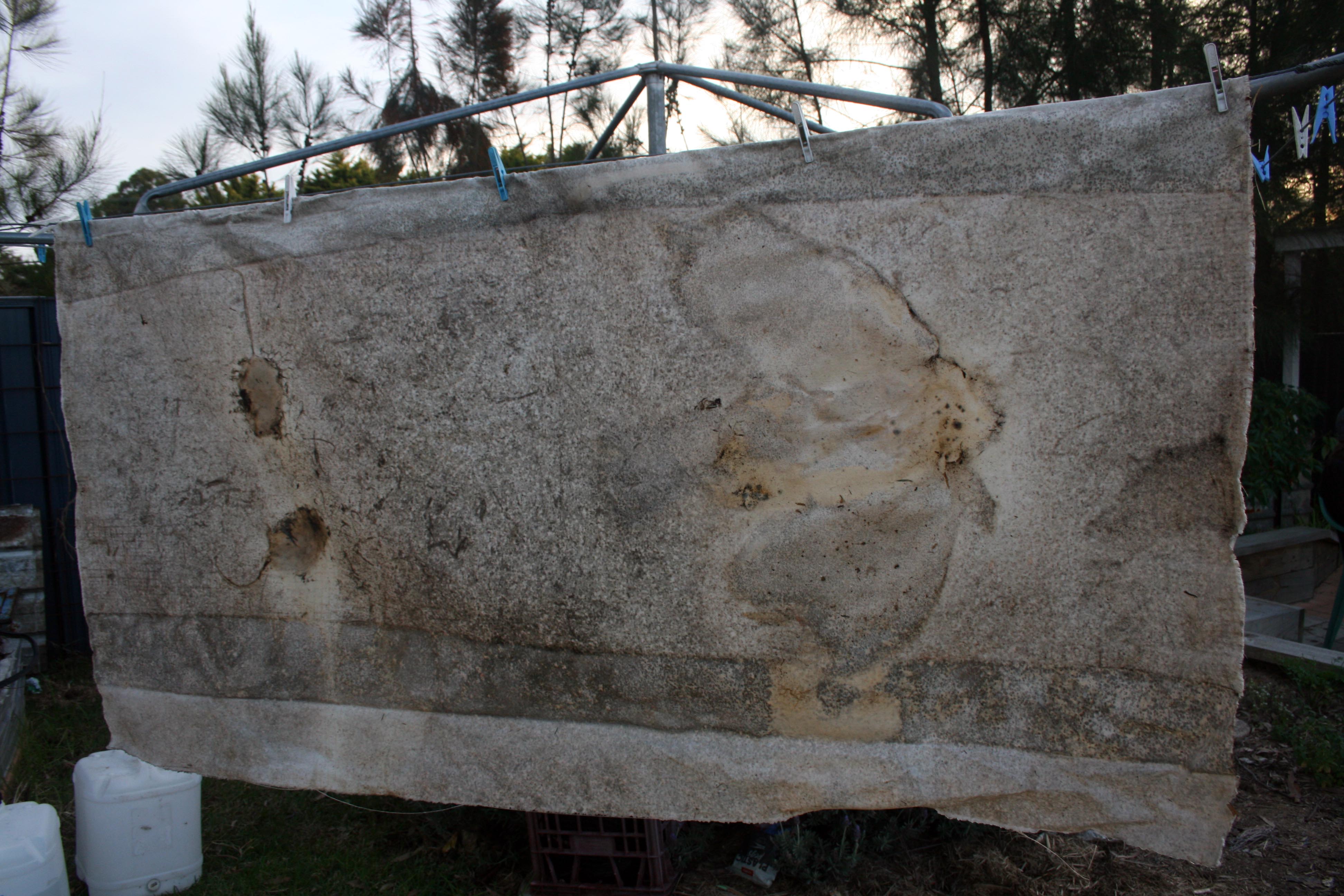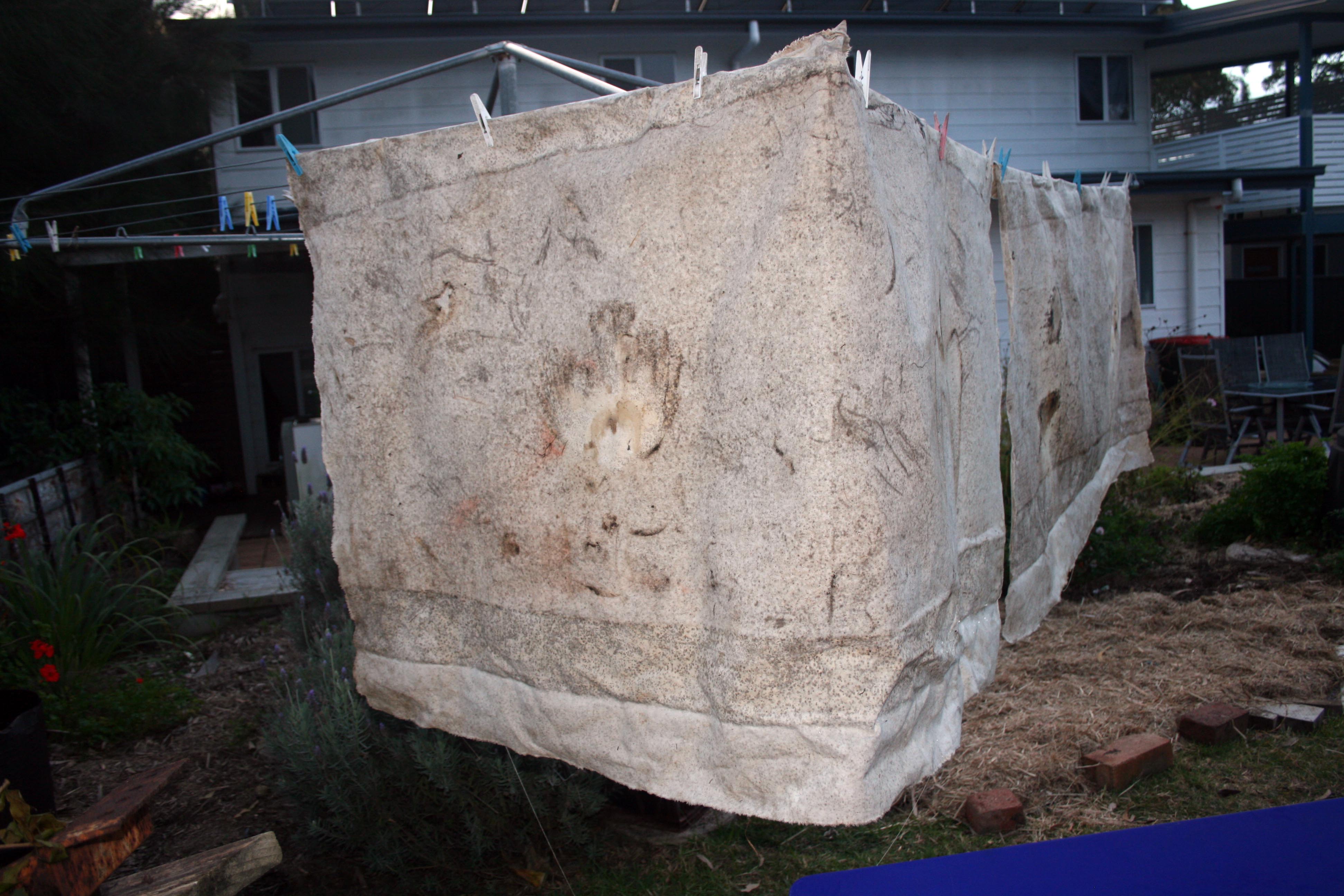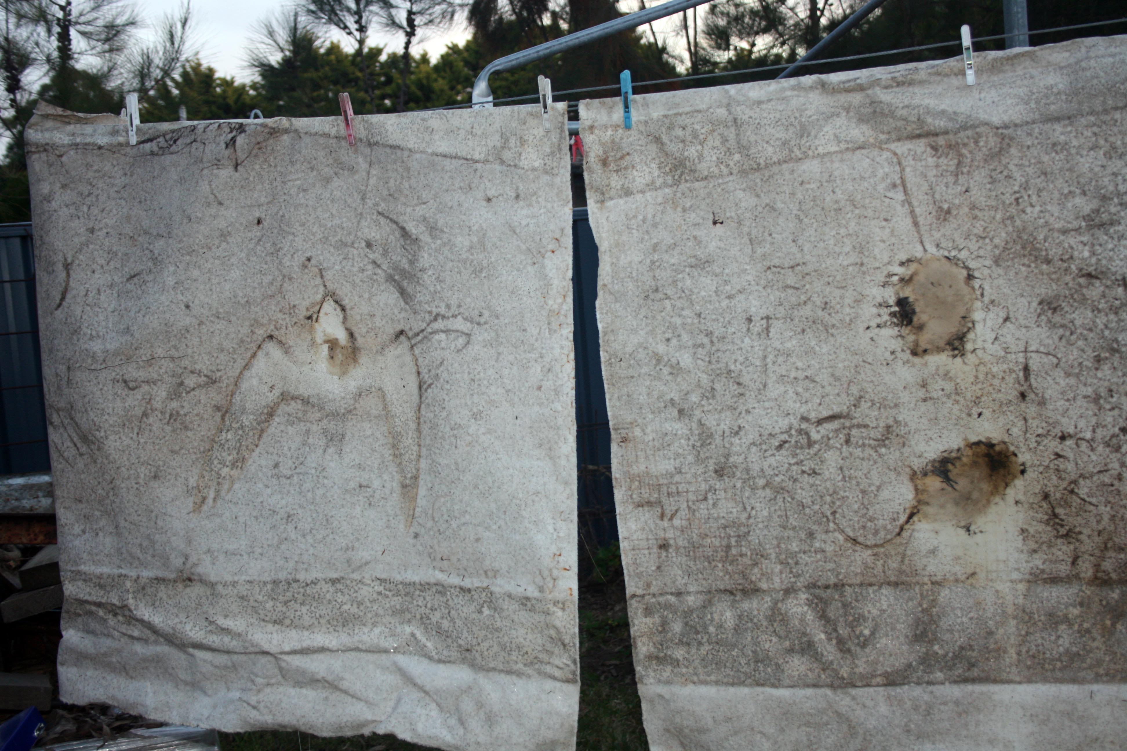 Darren and I set up a third shroud set at David and Linda’s farm in Nerriga today. First we dealt with Autumn Shroud Set 2 by removing the decomposed lace monitor, leather jacket, pardalote, laughing dove and rainbow lorikeet from their canvases. The prints were amazing yet again, aside from the pardalote which hardly left a mark. The Winter Shroud Set consists of a tawny frogmouth, a kingfisher, two baby flying foxes and two micro bats.