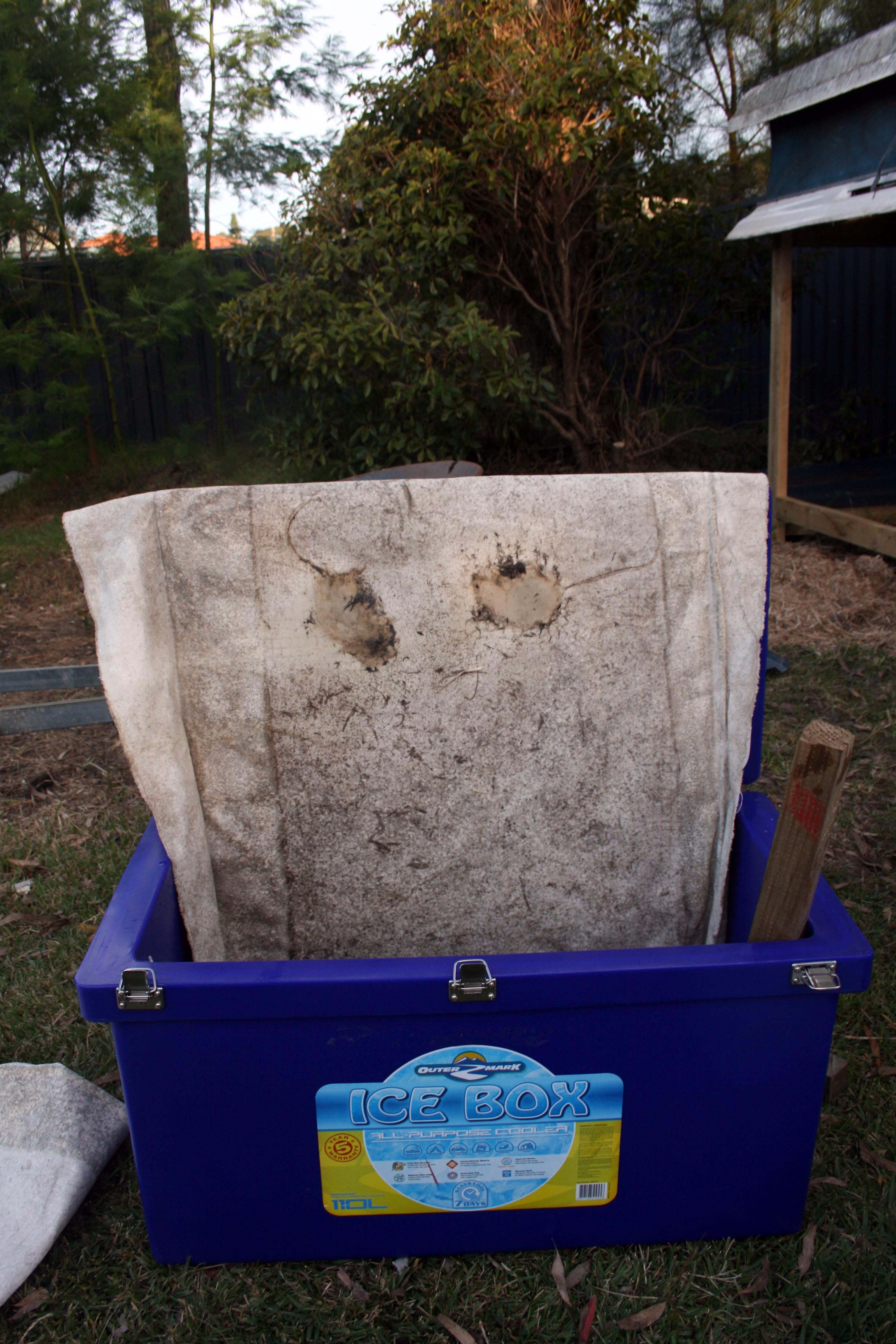 Today Darren and I headed out to Nerriga, it felt like spring even though it was overcast. I finally got to the bottom of my chest freezer finding the last three bodies. There was another huge lace monitor, a medium grey bird – not sure what type of bird – and a ringtail possum. We also collected the first winter shroud set featuring two baby flying foxes, two micro bats (only one was there!), a tawny frogmouth and a kingfisher. They were all beautifully preserved. I put the shrouds in vinegar baths and hung them out on the line at home.